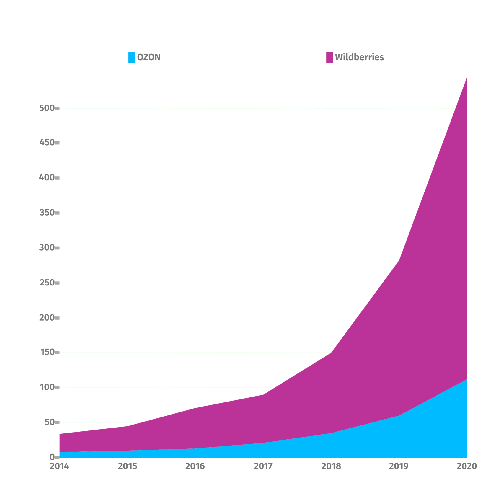 За 2020 совокупный оборот составил 544 миллиарда рублей (Wildberries - 432 млрд руб и Ozon - 112 млрд руб).